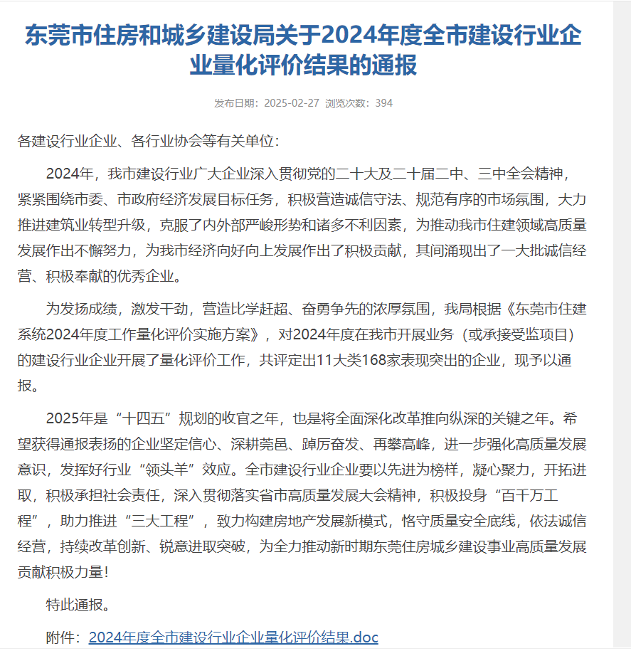 近日,東莞市住房和城鄉(xiāng)建設局發(fā)布《關于2024年度全市建設行業(yè)企業(yè)量化評價結果的通報》,廣東中青建筑科技有限公司憑借在房屋鑒定領域的技術實力、誠信經(jīng)營和突出貢獻,成功獲評“房屋鑒定機構類優(yōu)秀單位”的榮譽。?這是繼公司多次獲得行業(yè)認可后,再次斬獲的政府權威殊榮,標志著公司在專業(yè)能力、社會責任及行業(yè)影響力方面再上新臺階。